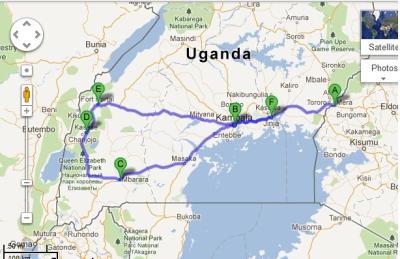 Vor kurzem reiste ich zusammen mit Leandra, einer anderen Freiwilligen nach Uganda. Eine Stunde Fahrt von Bungoma ist Malaba (A), die Grenzstadt. Von dort ging es weiter nach Kampala (B), die Hauptstadt und das absolute Zentrum Ugandas. Es ist das selbe Phänomen wie in Kenia: Urban können sich außer der Hauptstadt nur 1-2 andere Städte nennen, die meisten Menschen fristen ihr Dasein auf dem Land. In Kampala leben geschätzt circa 3,5 Millionen Menschen, die nächstgrößere Stadt Jinja (F) hat nur 100,000 Einwohner.